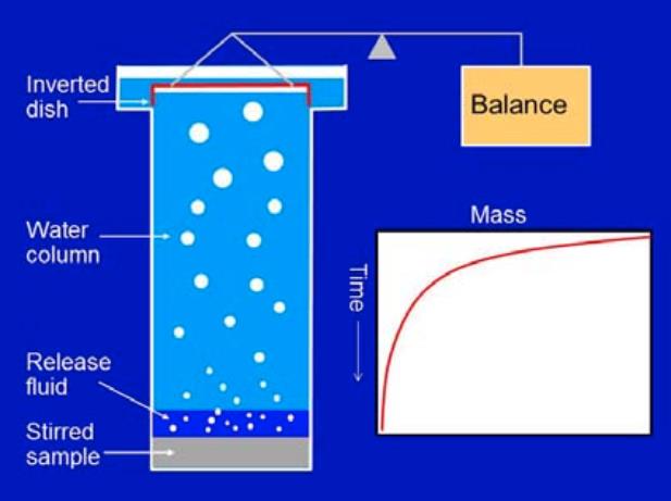 通過水柱上升的氣泡被收集到一個(gè)倒置的皿(浮皿)中,這個(gè)皿是浸在水中并且連接到一個(gè)靈敏的天平。當(dāng)氣泡聚集在皿上時(shí),由于水被空氣替代,皿的表觀質(zhì)量會(huì)降低。皿的表觀質(zhì)量會(huì)隨時(shí)間記錄下來。
